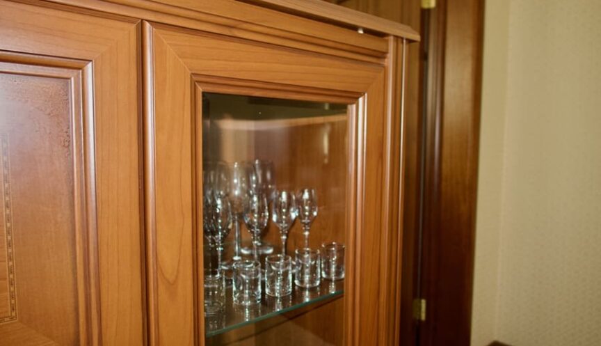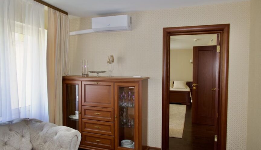 Мебель в номере: двухспальная кровать, диван, прикроватные тумбочки, сервант, журн. стол